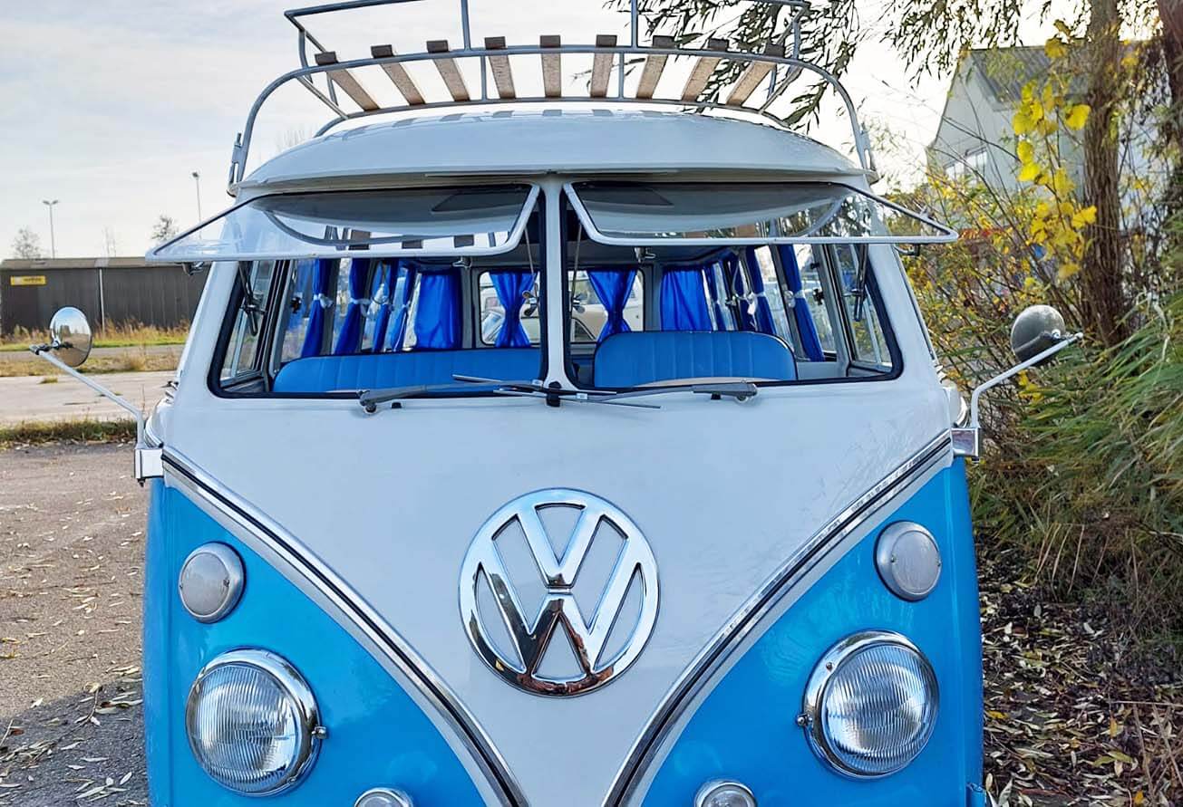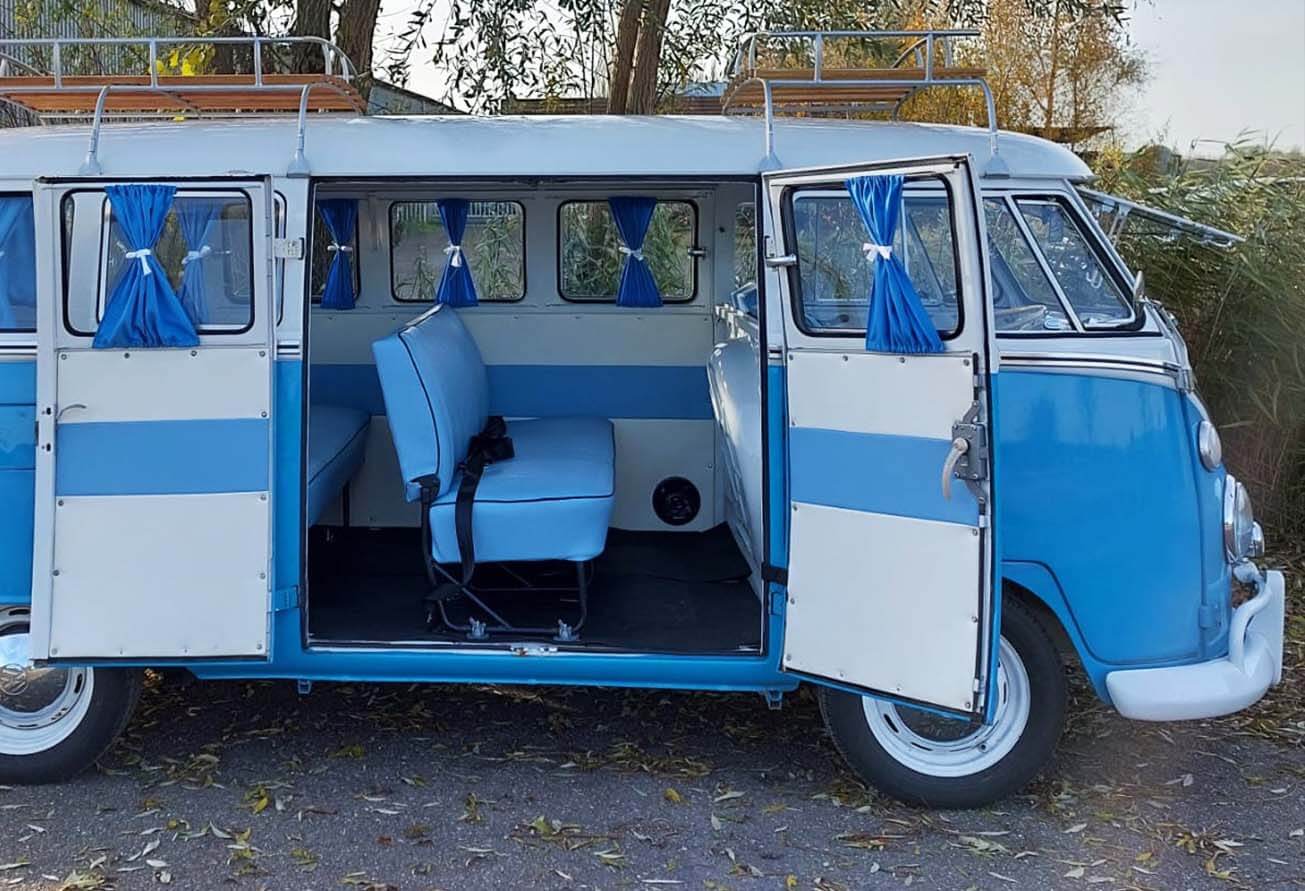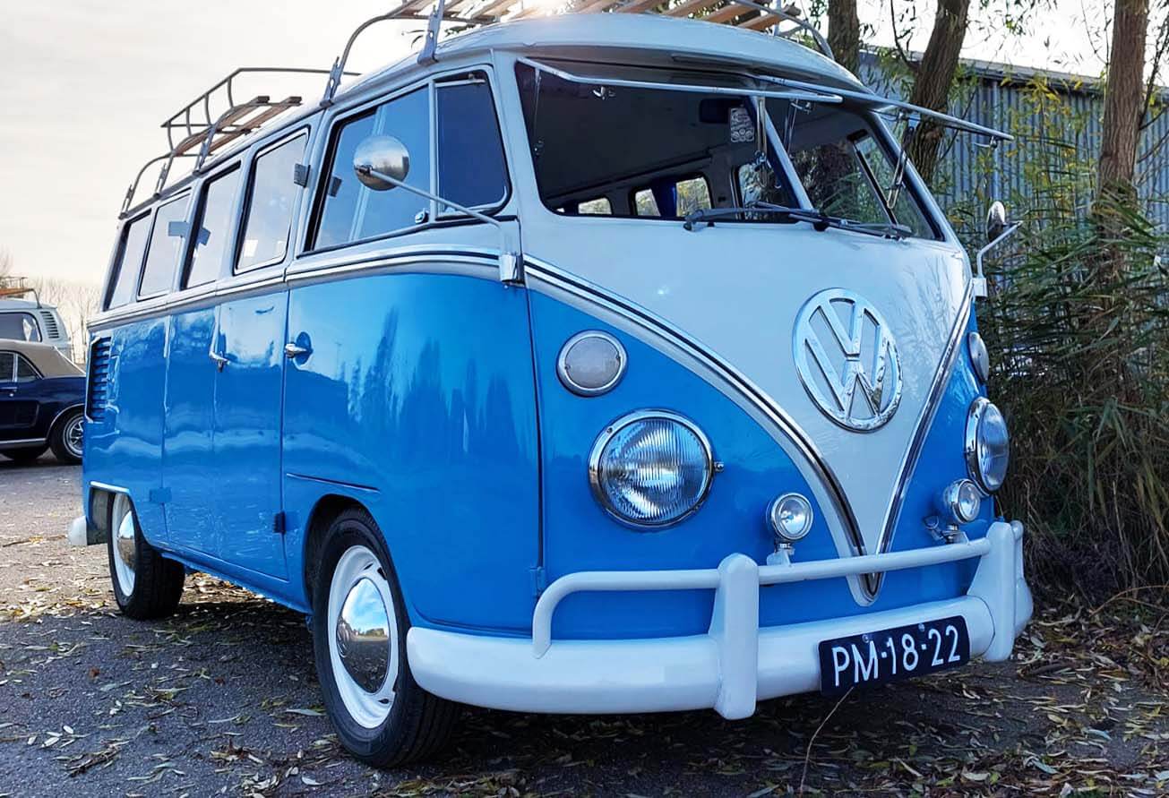 Onze zeeblauwe Blue Lagoon Volkswagen T1 bus is een klassieke eyecatcher die sinds eind 2021 deel uitmaakt van onze collectie. Dit model is het allereerste type bus dat Volkswagen ooit bouwde en is herkenbaar aan de iconische witte spijl aan de voorzijde.