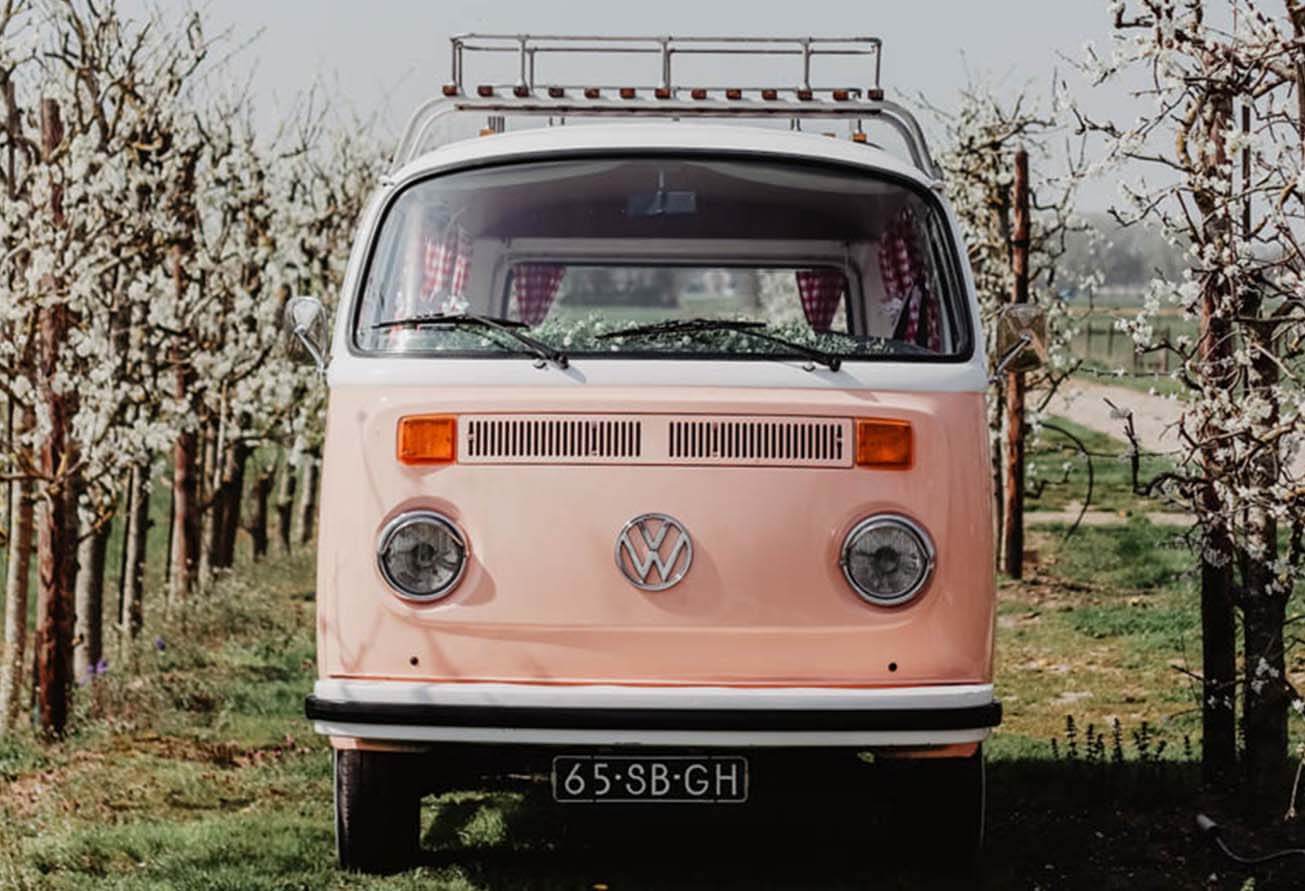 Onze Miss Peach is een bijzondere Volkswagen T2 bus uit 1972 in een zachte perzikkleur. Met haar vrolijke en elegante uitstraling trekt ze overal de aandacht en brengt ze meteen een glimlach op ieders gezicht.
